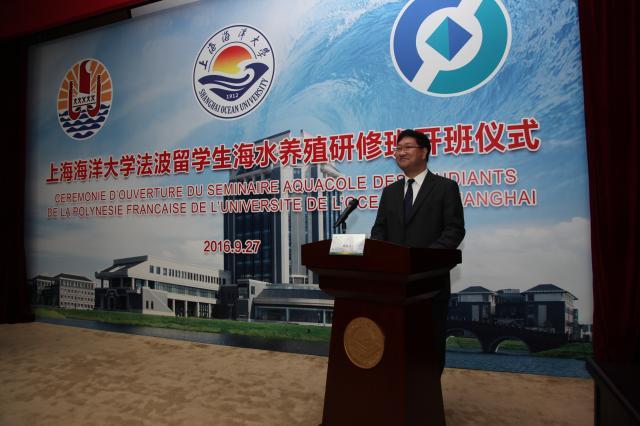程裕东校长在开班仪式上致辞,对来自法属波利尼西亚的10名学生表示热烈的欢迎,对法属波利尼西亚政府、中国人民对外友好协会、天瑞投资管理有限公司为促成此次培训班所做的努力表示衷心的感谢。他表示法属波利尼西亚水产养殖人才培训班学生的到来进一步拓展了我校国际交流的范围,是学校响应我国政府“一带一路”的新举措,为我校、天瑞、法属波利尼西亚三方的合作奠定了坚实的基础,同时希望同学们能尽快适应环境,学习专业知识,体验中国文化,体验上海的特色地方文化,在实践中感受中国。