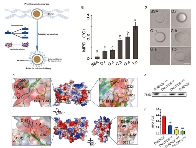 陈良标课题组客座访问学者曹立雪博士和黄巧硕士等经过长期的研究发现,南极鱼的卵壳蛋白基因家族(AnnotoZPs)存在与低温相关的基因扩增并且获得了冰晶融解促进活性(icemelting-promoting(IMP) activity)。AnnotoZP的一些成员具有结合冰晶的活性和非依数性降低溶液冰点的功能,在中等浓度情况下可以降低溶液的冰点0.26~0.65°C。该研究通过转基因斑马鱼实验证明,表达外源AnnotoZP的斑马鱼卵在冰冻条件下的存活率显著提高,含有外源AnnotoZP蛋白的斑马鱼卵壳蛋白溶液的冰点明显降低。该研究通过AnnotoZP的突变分析证明AnnotoZP的ZP结构域和酸性残基是IMP活性所必需的结构,从而阐明了AnnotoZP等一类蛋白通过独特的ZP-冰晶结合机制抗冻,是一种不同于已知抗冻蛋白的抗冻机制。