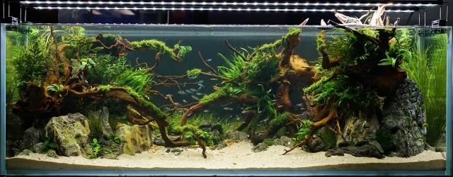 本届赛事赛制与往届不同,各参赛团队需在校内制作实物,网上提交影像作品初评,决赛前往大连参加现场答辩。赛事通知的发出到提交作品只有短短20余天,时间紧、任务重,给各高校参赛团队带来了很大的压力。我校参赛选手梁炳辉、王童、问高生团队在综合考虑硬件资源、作品风格、成景时间等因素的基础上,决定不使用生长周期长的前景草,构建能快速成景的以青龙石和杜鹃根为主体框架的亚马逊丛林风格水景。在两位老师的指导下,经过长达20余天细心的构图、造景、维护和修整工作,该作品不论是整体还是局部都达到了令人满意的状态。