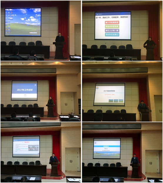 谭洪新院长首先从政治理论学习、履职能力、个人业绩、工作展望等四个方面向全体教职工进行了岗位述职报告;张宗恩书记用“融入学院增和谐,推进改革促发展,抓住人才创一流,带好队伍是核心”这四句话归纳了他这一年来的工作成绩;林海悦副书记从就业、资助、学风建设、党建、研究生、心理健康教育等6个方面系统的回顾了这1年来的工作开展情况;黄旭雄副院长分别从自己分管的本科教学工作、个人业务、遗憾与期待等方面对1年来的工作进行了系统的梳理;陈再忠副院长从政治理论学习、分管的研究生工作、个人业绩、不足之处及下一步打算等5各方面进行了了总结汇报,杨金龙副院长对自己分管的科研、科技工作、个人业绩、不足之处及展望等方面进行了述职总结。