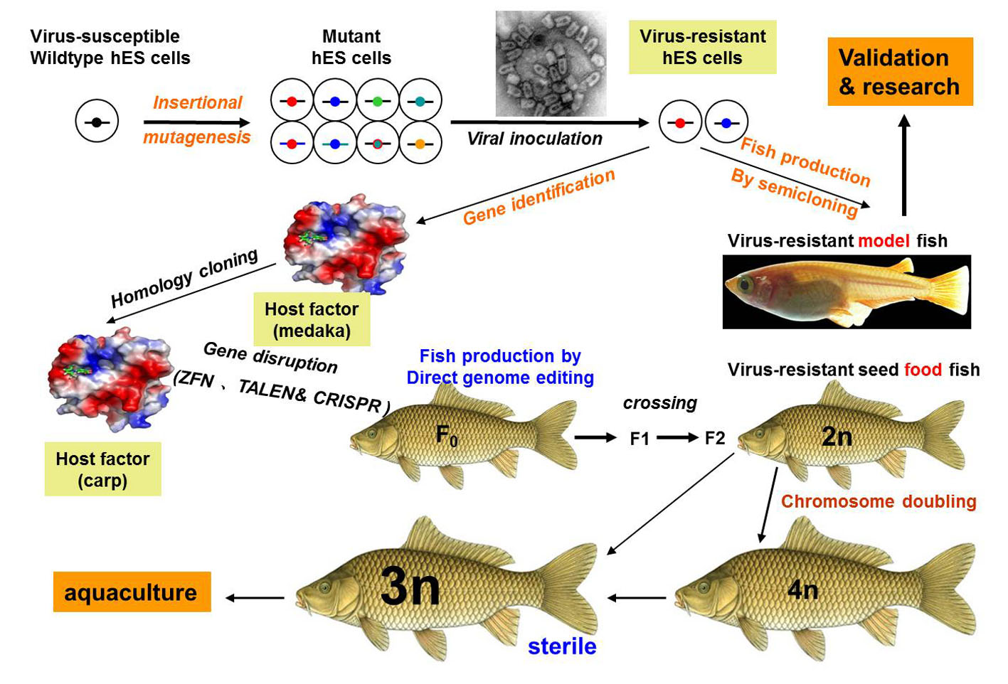 以青鳉为模型,建立起方法学,然后运用于应用研究。主要领域有细胞、遗传、发育、生殖、干细胞生物学、分子和鱼类进化。具体如:A)利用青鳉了解生殖细胞发育、性别决定与性别分化的网络调控机理;在经济鱼类施行性控育种;B)利用青鳉单倍体胚胎干细胞筛出病毒的宿主致敏性基因的基础上,通过基因敲除技术获得抗病鱼;C) 建立重要经济鱼类种质资源细胞库和复种新技术。建立和冻存重要经济鱼类的全能或多能干细胞,包括囊胚细胞、胚干细胞和生殖干细胞,形成种质资源细胞库。通过细胞移植来“借腹怀胎”或产生新个体来扩充遗传变异。