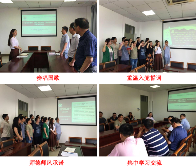主题党日活动分为四个部分:一是全体起立,奏唱国歌;二是全体党员重温入党誓词;三是践行师德师风学习承诺;四是集中学习与交流。重温入党誓词的庄严宣誓让支部党员不忘初心,牢记共产党员的政治责任和历史使命,保持共产党员的先进性和政治本色。全体党员认真学习了《350vip葡京新集团建立健全师德建设长效机制实施方法(试行)》和《关于基层党组织和党员在本科教学工作审核评估中进一步发挥作用的通知》等文件精神,并就践行高校教师职业道德规范与师德禁行行为“红七条”作出郑重承诺。支部成员-学院党委书记张宗恩虽出差在外,也通过微信互动作了交流发言。