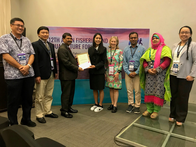 2019年4月8日-12日,第12届亚洲渔业与水产养殖论坛在菲律宾伊洛伊洛开幕,在4月10日晚上的亚洲水产学会理事会上,葡京新集团官网博士留学生Nattida Boonpeng(娜缇娜)获得第五届“Yang Yi Young Scientist Fellowship”(杨毅青年学者奖学金)。基金理事会理事长Hillary Egna博士、第12届亚洲水产学会理事长J.K Jena和新任理事长Alice Joan Ferrer教授以及导师刘利平教授共同为获奖者颁奖,论坛与会者共100余人见证了颁奖仪式。
