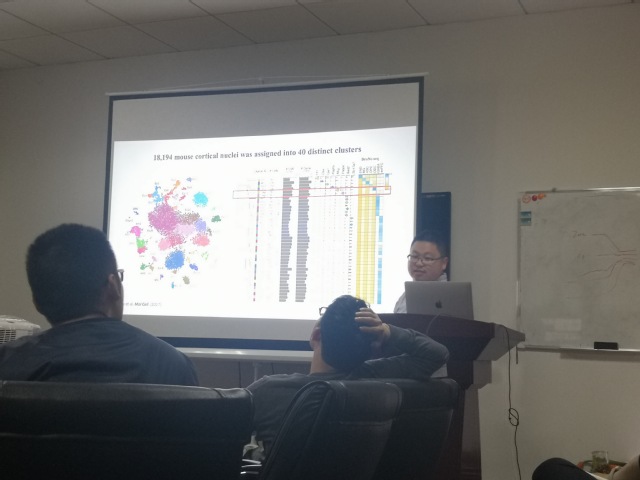 胡鹏博士首先介绍了单细胞测序技术的研究进展以及多种高通量测序技术优缺点,对于一些较难分离完整单细胞悬液的组织或者冷冻样品,单细胞核测序技术有着明显的优势,胡鹏博士通过研发高通量高通量细胞核测序技术(sNucDrop-seq),系统的解析了小鼠大脑中40多种不同的细胞类型,其研究成果发表于cell子刊molecular cell。进一步利用这项技术解析了小鼠心肌症模型中不同细胞类型特异的调控网络,其成果发表于国际知名期刊Genes & Development. 随后介绍了最新正在研究中的新生转录本单细胞标记技术,通过这项技术可以在单细胞水平研究mRNA的代谢动力学。最后,通过展示单细胞测序技术应用于小鼠垂体上研究的例子,为我们揭示了如何通过这项技术来解决实际的生物学问题。引发与会人员的广泛兴趣。350vip葡京新集团相关科研人员和研究生认真听取了报告,并就感兴趣的问题与胡博士展开了热烈的交流和讨论。