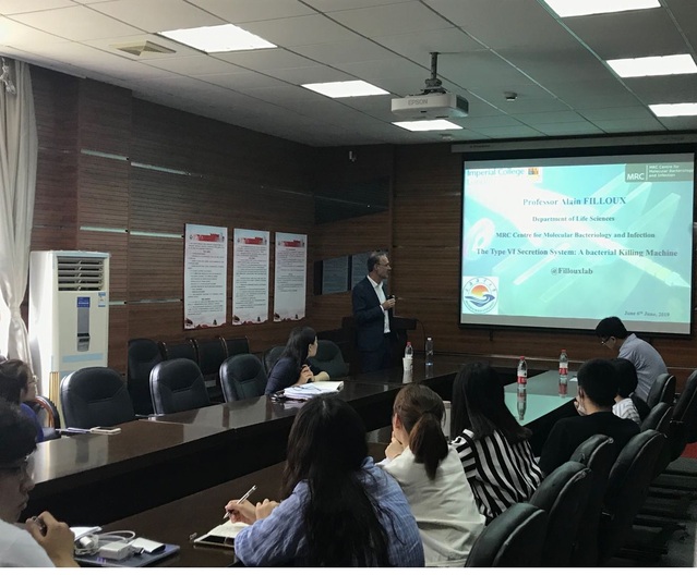 Alain Ange Marie Filloux教授在分子基因和蛋白结构的水平上,详细地向师生们介绍了T6SS免疫系统在模式菌株铜绿假单胞菌中的应答过程。T6SS免疫系统是当前微生物免疫的国际研究热点。Alain Ange Marie Filloux教授讲述内容生动具体,让学院师生认识了在前沿生物科学技术下的分子生物学研究水平。