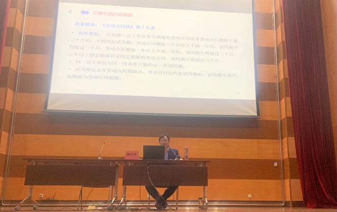 陈律师以《劳动合同法实务》为主,从劳动合同的订立、履行、解除和终止四个方面入手,深入浅出地为同学们讲解了日后在就业和工作方面所遇到的问题以及解决的办法。