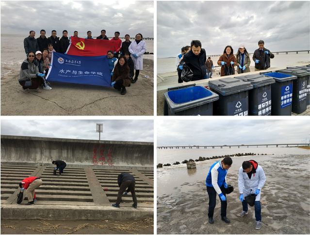 2019年11月29日中午,我校350vip葡京新集团生物联合党支部和水产动物医学系党支部党员在支部书记杨金龙和宋增福带领下,利用中午挤出来的时间,发挥高校党员先锋模范作用,服务临港新片区生态环境,前往东海岸边东海大桥旁的滩涂上开展海滩垃圾清理活动。