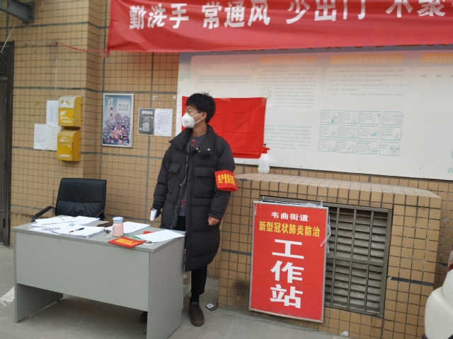 王璞同学从2月23日至26日,每天早八点至中午十二点,下午一点半至晚上六点在韦曲街道防疫工作站值岗,主要职责是对小区出入的居民进行登记和体温测量。按照当地要求和规定,小区给每个家庭发放出入证,每户每两天有1小时的时间可以派一人外出买菜,出行时都要进行登记。值岗过程中,遇到一些人员不配合工作,对此,王璞同学会耐心劝导,不厌其烦地给他们讲述防疫知识,确保小区居民的安全。