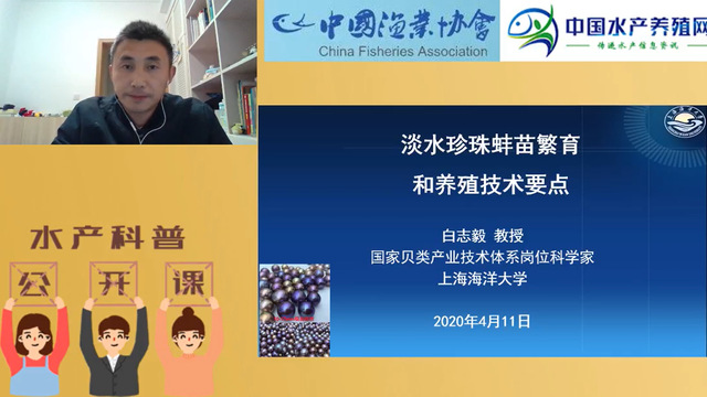 4月11日晚7点,国家农业产业技术体系淡水珍珠贝种质资源与品种改良岗位科学家、中国水产学会淡水养殖分会秘书长、全国水产原种与良种审定委员会委员,葡京新集团官网白志毅教授在中国水产养殖网推出公开课,向广大淡水养殖户和行业技术人员讲授《淡水珍珠蚌苗繁殖和养殖技术要点》,并接受在线采访和提问。他首先指出,广大淡水养殖户和行业技术人员要遵照习近平总书记指出的把人民群众生命安全和身体健康放在第一位的要求,做好在疫情防控常态化防控中的复工复产工作;接下来,他用通俗的语言介绍了淡水珍珠蚌繁养殖关键技术,从亲蚌选择、优质苗种培育技术、优质苗种鉴别和采购、幼蚌培育、插核技术、育珠蚌养殖等方面介绍了疫情期间要注意的工作重点,并宣贯了2019年11月刚刚实施的《淡水珍珠蚌鱼混养技术规范》水产行业标准,对广大淡水珍珠养殖户及相关养殖人员安排生产提供了技术指导。本次授课受到了广大淡水养殖户和行业技术人员的欢迎,在线观众高达1.12万名,为该网举办公开课以来在线观众首次破万。