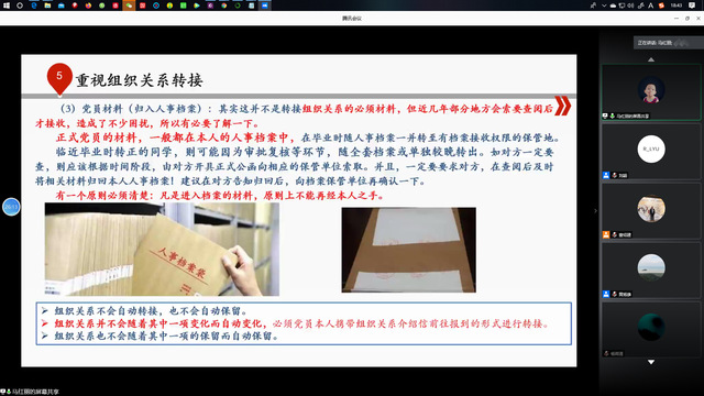 马红丽就毕业生党组织关系转接相关工作做了讲解。从为什么要转接组织关系到如何转接落实都做了详细阐述,总结归纳了转接过程中可能出现各种问题并提出解决办法。她强调,党员同志必须遵守党章和党员教育管理工作条例规定,按期完成党组织关系的转接工作。董绍建随后对组织关系转系工作的重要性和注意事项等做了补充和说明。
