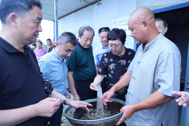 全国水产技术推广总站副站长胡红浪现场查看蚌的照片