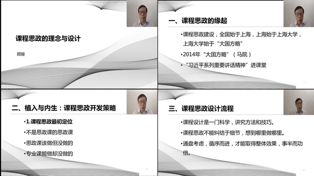 该培训会由北京华思培教育科技院主办,采取直播学习+回看巩固+微信群互动交流的组合方式进行。会议邀请了课程思政首创者—上海大学顾骏教授为我们了课程思政的起源与发展,并通过实际案例:“爱情密码”如何转化为“情礼之间”?“机器人也需要讲伦理吗?”等讲解课程思政的开发策略以及设计方法,深入浅出,让人受益匪浅。