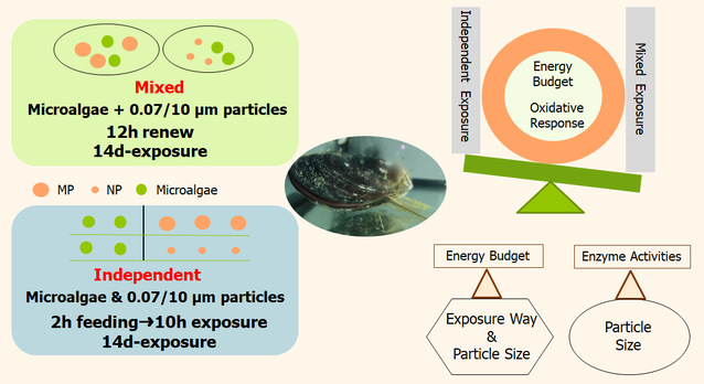 团队研究不同粒径的纳米和微米级塑料颗粒在不同组织中的生物积累情况,结果表明:贻贝对微塑料的摄入具有尺寸依赖性,直径小于10 μm的微塑料清除速率大于100 μm微塑料;消化道是微塑料累积的主要部位,小粒径颗粒更容易在体内蓄积(Wang et al. 2020b)。在自然环境中,各营养级生物均可能暴露于微塑料污染条件下,微塑料和微藻可一同被贻贝摄入。团队研究发现微藻和微塑料的混合影响了微塑料的表面基团;同时,微藻和微塑料的混合缓解了微塑料对厚壳贻贝能量收支的影响。