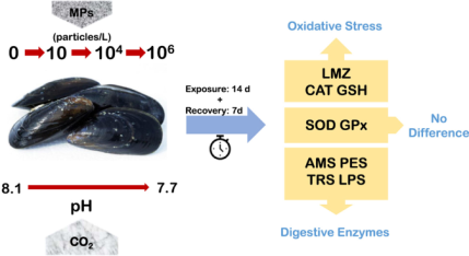 现实环境中多重胁迫因子与微塑料共存,团队聚焦于微塑料和海洋酸化的复合胁迫,发现海洋酸化可以增强微塑料对贻贝的消化系统和抗氧化系统的毒性;复合胁迫对消化系统的影响更为明显。研究表明:微塑料可作为载体负载海洋环境中的其他污染物。团队以多溴联苯醚(BDE-47)为典型污染物,从贻贝的免疫防御、氧化应激反应和能量代谢等方面揭示了微塑料作为环境污染物的载体如何影响贻贝的生活。研究发现贻贝在微塑料和BDE-47共暴露下减少了食物的摄入,但却试图通过增加耗氧量和改变能量供应方式来调节自身生理活动。研究表明贻贝能在短时间内积极应对这种恶劣的环境,但长期生活在这种压力源下的贻贝自我调节机制会紊乱最终导致生长和存活率下降。