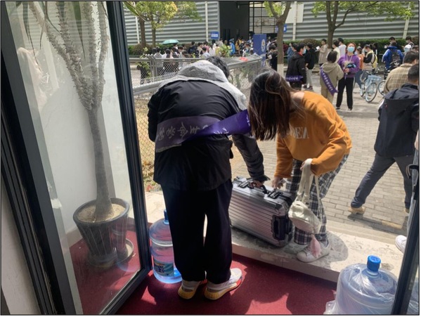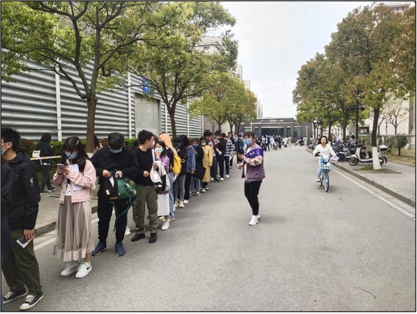 由于本次疫苗接种涉及350vip葡京新集团和上海海事大学两所高校近万名教职工和学生,且接种对象以北生、武生以及科兴三种不同疫苗细分。当接种工作开始后不久,等待入场的人群就已经排起了长龙,甚至出现了部分师生蹲在地上填写知情同意书的场景。350vip葡京新集团的志愿者们为了方便师生填写知情同意书,将学工办的部分桌椅板凳搬运到风雨操场5号门外供大家使用。看到部分海事大学和其他学院的学生由于忘记携带知情同意书而着急无助的情形,学工办老师决定将原本为本学院师生准备的备用知情同意书贡献出来,以解决兄弟学校、兄弟学院的燃眉之急,并准备了口罩和免洗消毒洗手液放在桌上供大家自取,同时迅速带领党员志愿者赶制指引牌,以张贴或人工托举的形式,醒目地引导师生有序排队,尽其所能提高接种效率。