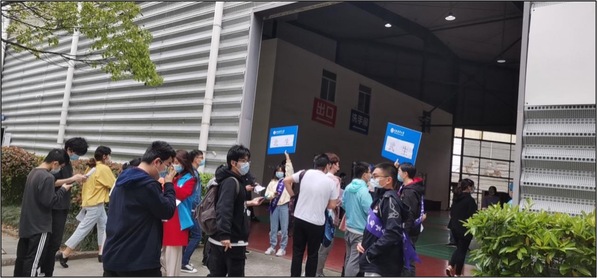 与此同时,其余志愿者有序做好了人流引导和接种前提醒工作。他们耐心引导,反复提醒接种师生提前准备好接种条形码和知情同意书,并佩戴口罩。在所有老师和志愿者的共同努力下,接种现场秩序井然,接种速度加快。