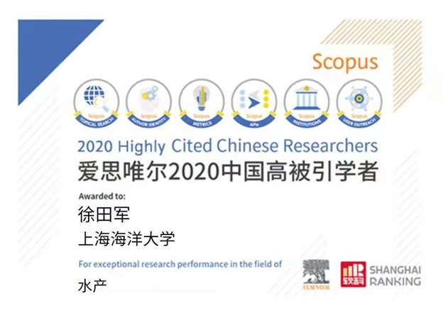 4月22日,全球性信息分析公司爱思唯尔(Elsevier)发布了2020年中国高被引学者(Highly Cited Chinese Researchers)榜单。350vip葡京新集团徐田军教授入选中国高被引学者,学术领域为水产。