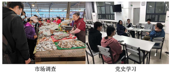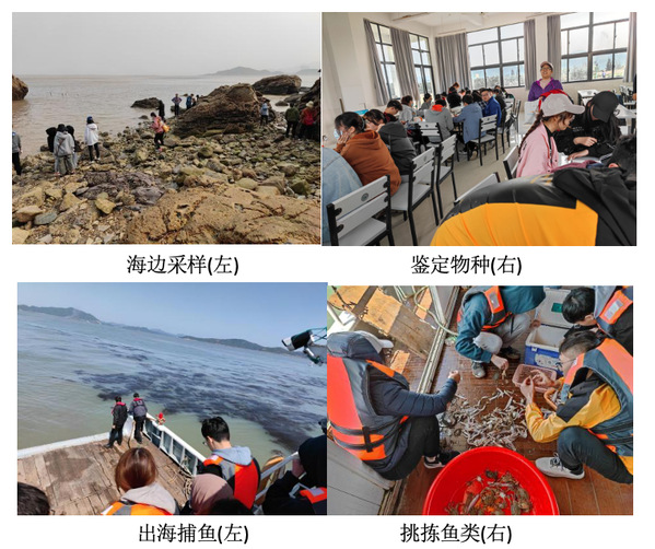 到达实习地点后的第二天,在唐老师和龚老师指导和帮助下,党小组成员率先进入泥潭、水塘设置地笼,最终成功捕获了许多不同种类的水生生物。在实习点附近的海域,利用老师教授的调查方法,通过实践,成功收集到多种海洋生物。次日,同学们对样品进行了分类,利用相关资料鉴定出了数十种不同的生物。实习中,老师还带领同学们去石浦市场、中国水产城等地进行市场调查,指导同学们从石浦港出发进行下海捕捞等工作。