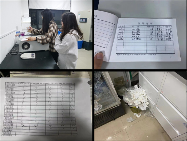 在检查的过程中,巡查小队发现各个实验室都能够按照要求对实验室的药品以及实验工具进行正确摆放和使用,进入实验室进行科研实验中均能穿好实验服,针对各种实验仪器的使用能够做好安全台账记录,经排查未发现实验室安全隐患。同时也发现,大多数实验室对于科研垃圾以及日常垃圾管理仍不到位,垃圾未能及时清理等。对于存在的问题,巡查小组队员及时找到实验室相关负责人进行提醒,并做出整改,各实验室对待巡查工作态度非常友好,能够将存在问题及时处理。