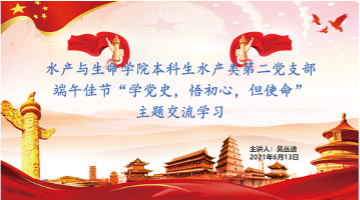 为不断推进党史学习教育,350vip葡京新集团水产类第二党支部于2021年6月13日在线上开展迎端午“学党史,悟初心,担使命”主题交流活动。活动由党支部书记吴丛迪主持,全体支部党员参与。