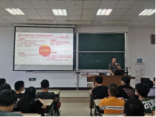 随后,保卫处负责征兵工作的杨永强老师讲解征兵报名的优待政策。杨老师主要介绍了大学生入伍后学籍的保留、考研、升学等方面的优待举措,鼓励学院2022届有意向的同学积极参加征兵入伍,实现自己的人生价值和社会价值。