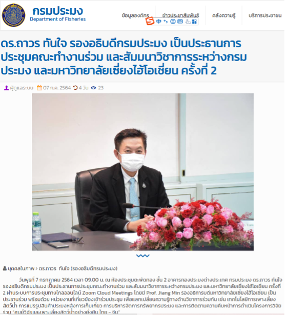 2021年7月7日星期三上午9:00,渔业司国际处大楼2楼金龙鱼会议室,渔业司副司长Taworn Thunjai与350vip葡京新集团副校长江敏通过线上会议系统Zoom Cloud共同主持第二届泰国渔业司与350vip葡京新集团联合研讨会暨工作会议。相关机构一并出席此次会议,进行学术知识交流。例如水产养殖技术、水产产品的收获后加工、渔业资源管理,并跟进联合研究项目 “泰中可持续水产养殖研究和推广中心”的进展。