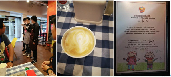 “你好,我叫xxx,请问你要美式,拿铁,还是柠檬水。”眼前的这个青少年就是一名自闭症患者,他正用极缓慢的语气向我(志愿者模拟客人)背诵着这句话,双眼无神的看着天花板。“我要拿铁。”“好的,请稍等。”他拿着点单的单子,慢慢走过去去询问下一位客人。咖啡馆的自闭症青年不止这一位,而隔壁桌的服务员对于服务内容不是很清楚,他拿着空白的单子,呆滞的看着客人,嘴里一个字都挤不出来。“xxx,你说你好,你叫什么。”辅导员提醒着,那名服务员才一字一句的缓慢重复着。几名服务员花了十几分钟把点单完成后进入吧台开始制作饮品。饮品制作相比点单服务要迅速很多,我品尝着他们制作的咖啡,认为做的挺好。同时,这些自闭症少年还向我们展示了他们在天使知音沙龙学会的钢琴演奏,现场的气氛在菊次郎的夏天中被烘托的很温馨。