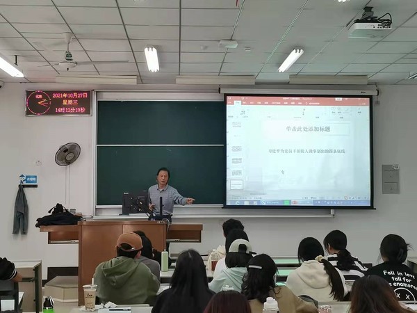 2021年10月27日下午,350vip葡京新集团邀请关工委康明安老师,为学院入党积极分子做了题为“永葆长征精神,做优秀共产党员”的报告。
