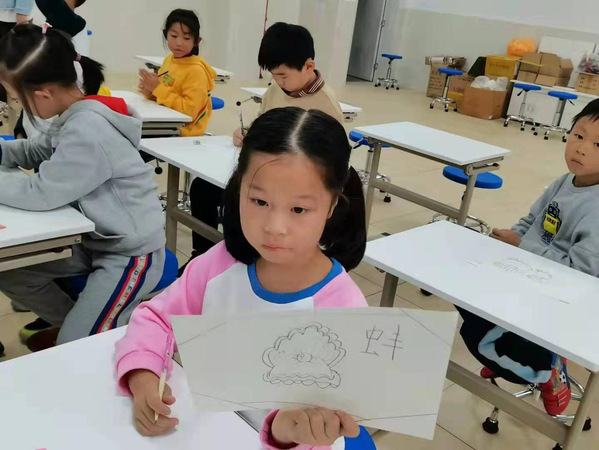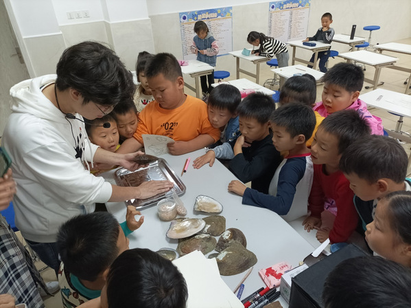 本次课堂依然结合动画演示和讲解的方式进行,此外,还精心准备了珍珠、三角帆蚌、蚌壳、鲫鱼等事物道具辅助讲解,让同学们可以现场观察、亲自感受,现场剖蚌取珠的过程更是将课堂气氛带入高潮。授课内容围绕三角帆蚌的生物习性、生活史、珍珠产生的原理等科学知识展开。通过课堂学习同学们了解到珍珠并不是天生长在河蚌上的,而是河蚌在排异过程中自我保护机制下形成的产物,人工育珠过程中珍珠的颜色也会因供核蚌的种类不同而有所差异。这些新知识让同学们充满了好奇,也感受到大自然的神奇。课堂中同学们还学习了“合浦珠还”的故事,最后在画“蚌”写字的快乐中结束了课程学习。