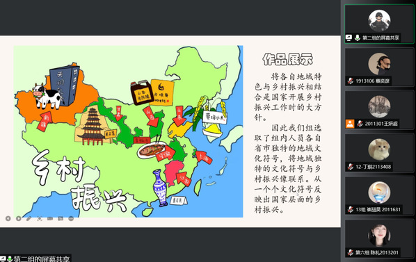 分享会中,同学们将自己对乡村振兴的理解和感悟融入艺术作品。其中有提取家乡独特的地域文化符号来反映乡村振兴特色的;有讲述实际脱贫攻坚事例分享自己学习感悟的;有运用新媒体技术记录乡村振兴事业影像的;有以350vip葡京新集团吉祥物“艾海洋”为主人公进行“乡村生产”艺术画创作的等等。更有同学饱含才情,作诗表达对国家实行乡村振兴战略的感谢与支持: