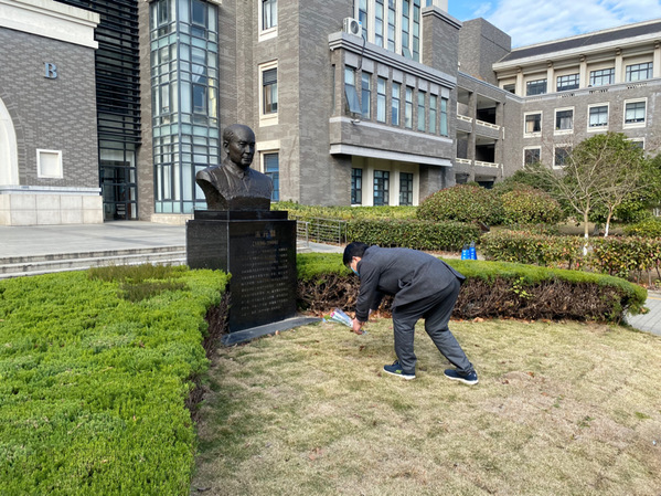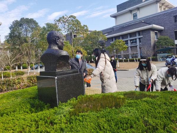 “除秽拂尘,焕新校园”。老师和同学们一起将朱元鼎先生的雕像擦洗干净,清理周围环境的落叶杂草,用新的面貌迎接新年,用劳动实践开启新篇。