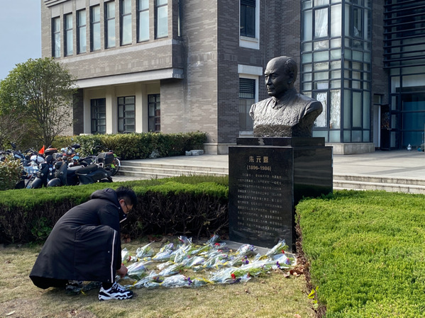 “敬献鲜花,致敬先贤”。用鲜花代表敬仰,用鲜花代表新的希望,向先贤致以我们最崇高的敬意。师生代表依次向朱元鼎先生雕像献花并鞠躬致敬。