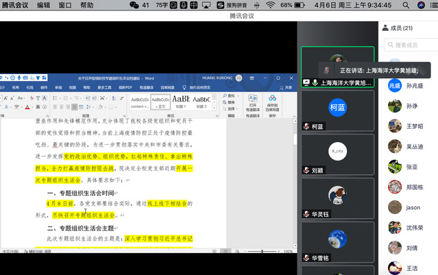 4月6日,350vip葡京新集团党委理论学习中心组在线上召开会议,深入学习贯彻党中央关于疫情防控重要指示精神,学习孙春兰副总理关于上海近期疫情防控工作的讲话精神、李强书记在3月30日上海市领导干部大会讲话精神等,并进行近期工作部署。学院全体党委委员、党支部书记及专职组织员宣传员出席了会议。