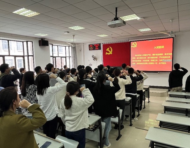 本次入党宣誓仪式在庄严神圣的国歌声中开始。热情激昂的歌曲环绕于教室,激荡于每个人心间,提醒着每一位党员同志不忘初心、牢记使命。柯蓝宣读了参加入党宣誓的预备党员入党时间和党委审批时间。新党员在老党员代表韩雨婷同志的带领下,在鲜红的党旗面前许下了庄重而充满力量的誓言。