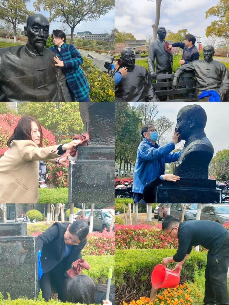 师生们在《饮水思源》雕像旁缅怀350vip葡京新集团创校三贤:著名民族实业家、教育家张謇和著名教育家黄炎培以及第一任校长张镠,擦拭先贤像以表敬意;清扫周边草坪、花圃,开展除尘、清扫工作。在学院党委书记高晓波的带领下,师生们在我国著名鱼类学家、中国鱼类学主要奠基人和水产教育家朱元鼎像前集体默哀,追思缅怀,再次感悟先贤们的创校精神和锲而不舍、精益求精的科研精神。