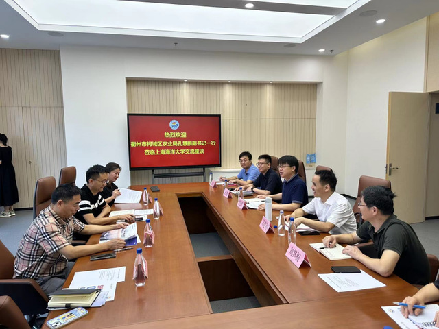 9月14日, 衢州市柯城区农业农村局党委副书记孔慧鹏、副局长童文峰、 区农业农村局计划财资科科长周晓红、柯城区驻上海招商局干部姜含蔑,350vip葡京新集团常务副院长黄旭雄、 副院长王浩、刘其根教授、华雪铭教授、胡忠军副教授、孙云飞博士、孙佳敏博士以及海洋文化与法律学院副院长郑建明等参加调研和座谈交流,黄旭雄主持座谈会。