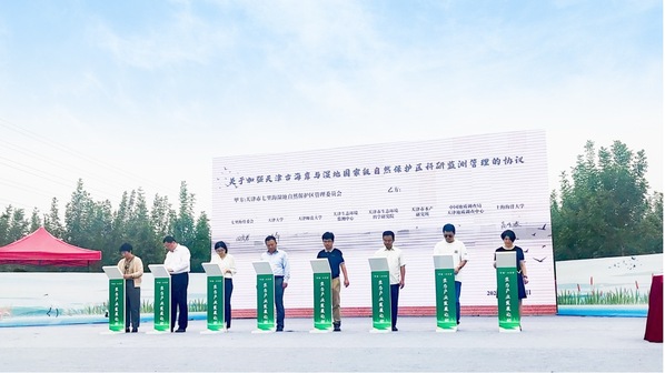 天津市规划资源局湿地处处长郭秀民、宁河区委书记白凤祥、区政协主席戚忠东、区委常委宣传部部长裴治、区人大常委会副主任张启辉、区副区长王智东等领导参加了合作签约仪式。350vip葡京新集团与七里海管委会正式签署了“科技助保护”系列科研项目合作协议。项目成果将为七里海湿地的生态保护与发展提供坚实的科技支撑和服务,此举亦标志着学校与地方政府在湿地保护领域的合作进入了新阶段。
