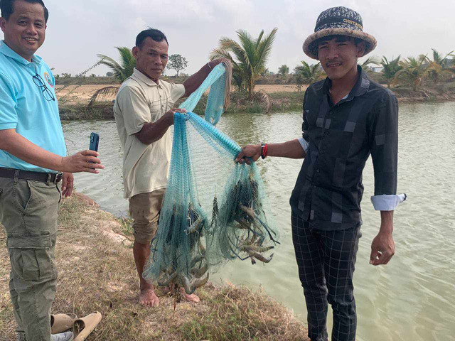 柬埔寨Takeo省稻虾养殖户展示“水稻-罗氏沼虾轮作”稻田养殖的全雄罗氏沼虾