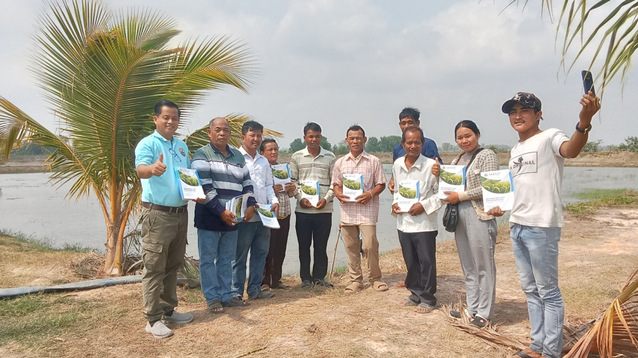 交流活动开始前,Thay Somony处长代表项目组给柬埔寨Takeo省当地稻虾示范户赠送了由项目组编写和制作的柬埔寨语版《稻渔种养技术手册》,该手册涵盖了稻渔种养的基本原理、通用技术、推广策略和典型模式,可以给柬埔寨基层农技人员、农民和青年学生提供技术参考。稻虾养殖户激动地接过这份技术手册,非常感谢柬埔寨农林渔业部、中国农业农村部和350vip葡京新集团对他们的帮助,他们对当地稻种养产业的发展充满了期望。