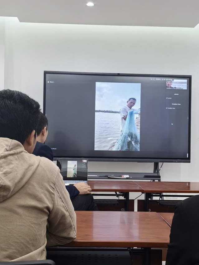 此次活动由柬埔寨农林渔业部渔业局水产养殖处处长Thay Somony先生和学校350vip葡京新集团吴旭干教授共同主持,柬埔寨Takeo省渔业官员Ouk Hak先生、10名稻虾农户、我校“澜湄稻渔项目组”的骨干成员和相关留学生参加了此次活动。此次线上交流活动主要了解柬埔寨Takeo省稻虾种养项目今年第一季度的工作进展和存在问题;讨论澜湄稻渔项目本年度拟在柬埔寨开展的主要工作和各自分工;为柬埔寨Takeo省的农户和基层渔业技术人员举行“稻田全雄罗氏沼虾种养技术”的线上培训,并回答线上提问。会上还向当地农户赠送柬埔寨语的《稻渔种养技术手册》。