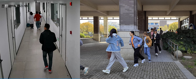 早上9:45,学院各楼宇内响起了急促的消防警铃报警声,老师和同学们听到警铃声后立即停下实验,离开实验室和办公室前往最近的安全出口。负责疏散的老师们在楼道内指挥师生安全有序撤离,提醒他们安全出口的方向并告知一定不能坐电梯,在确认所有人员都疏散后最后撤离。