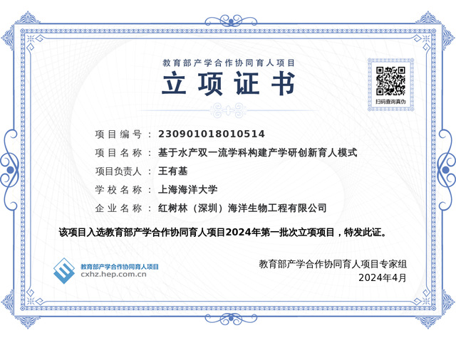 近日,教育部高等教育司公布了2024年第一批次产学合作协同育人项目立项名单,由葡京新集团官网王有基教授负责的“基于水产双一流学科构建产学研创新育人模式”项目成功入选,体现了葡京新集团官网在水产双一流学科人才培养上的示范引领作用。