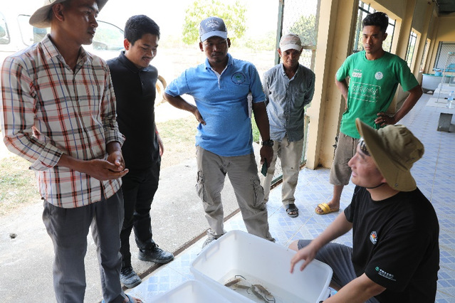 “澜湄稻渔项目组”到柬埔寨后,就马不停蹄进入全天候工作模式,精描“鱼米走廊”施工图。4月22日,“澜湄稻渔项目组”先后走访了茶胶省(Takeo省)的3个稻虾共生示范基地,现场采集了罗氏沼虾和水体样品,向30余位农民开展“水稻-罗氏沼虾共生技术”培训,并赠送了项目组编制的柬埔寨文版《茶胶省水稻-罗氏沼虾共生技术规程》,并给当地10位稻虾示范户赠送了2.5吨虾饲料。经过中柬双方科技人员的共同努力,茶胶省的“水稻-罗氏沼虾种养模式”,已经发展到20个农户,合计面积22.4公顷,目前种养面积和农户数量还在增加,“茶胶大虾”已经成为柬埔寨的地理标志农产品。