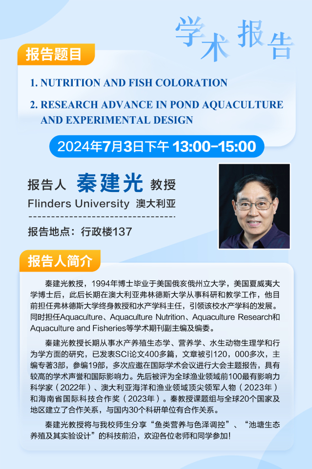 秦建光教授讲座—鱼类营养与色泽调控 、 池塘生态养殖及其实验设计