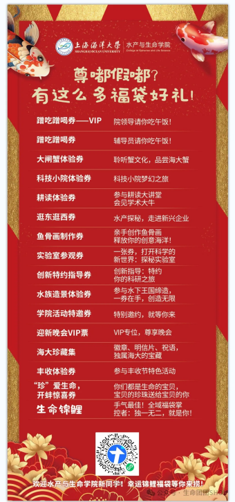 你们马上就要成为海大的一份子啦!即将融入我们学院这个大家庭~鱼,是我们学院的一大特色;锦鲤,更是鱼中的小明星。锦鲤象征着幸运、飞黄腾达!我们也希望刚入学的你们,可以一路好运、登峰造极。为了让你们更快地融入学院的大家庭,生命锦鲤红包墙走过路过不要错过,快来拿走红包,带来好运吧!好礼尊嘟很多哦!