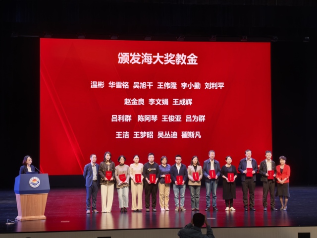 随后,会议进入了海大奖教金颁发环节。海大奖教金作为表彰学院德才兼备、工作踏实,在教学、科研及管理工作中做出突出贡献的教职员工而设立的奖项。此次获奖的教师们不仅在教学上取得了显著成绩,还在科研、学生工作领域有着重要贡献。学院党委书记高晓波、广东海大集团海大研究院人力资源总监陈力山为获奖教职工颁发奖励,获奖教师们纷纷上台接受表彰。