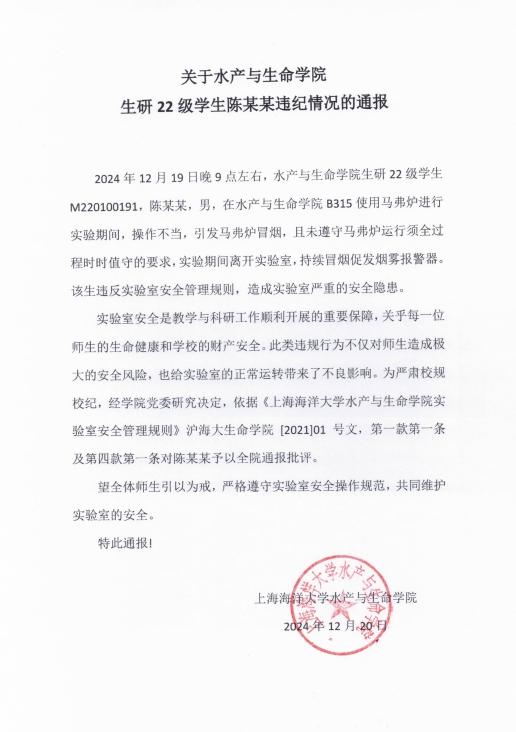 关于350vip葡京新集团生研22级学生陈某某违纪情况的通报