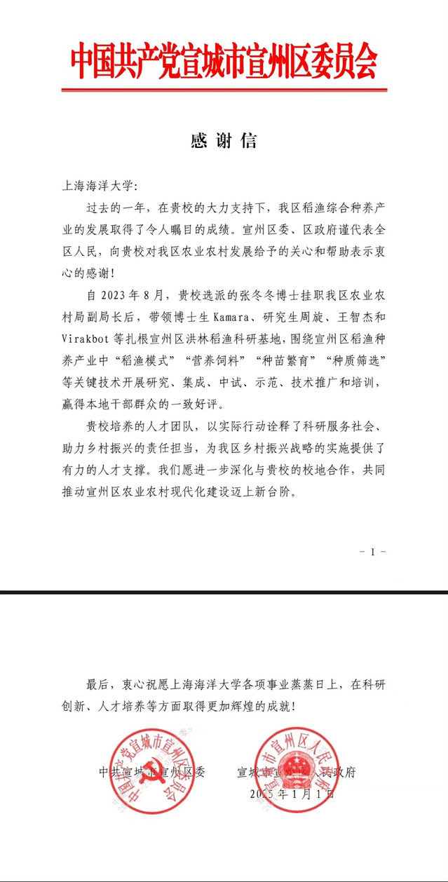 信中表示,自2023年8月,张冬冬博士后带领博士生 Kamara、研究生周旋、王智杰和 Virakbot 等扎根宣州区洪林稻渔科研基地,围绕宣州区稻渔种养产业中“稻渔模式”“营养饲料”“种苗繁育”“种质筛选” 等关键技术开展研究、集成、中试、示范、技术推广和培训,赢得当地干部群众的一致好评。学校培养的人才团队,以实际行动诠释了科研服务社会、 助力乡村振兴的责任担当,为宣州区乡村振兴战略的实施提供了有力的人才支撑。来信对张冬冬的相关工作予以表扬,对学校长期以来的大力支持表示感谢,希望学校今后继续支持宣州区农业农村现代化建设工作。