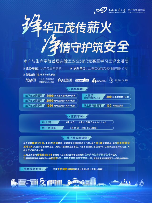 实验室安全知识竞赛将于3月12日启动,为期两周的线上积累赛将评选每日冠军,并角逐16强进行线下决赛,强化实验室安全规范的普及。根据相关管理规定,3月将开展办公室、实验室、学习室大扫除,并于3月15日起进行《最美研究生学习室》评比,评分标准涵盖消防安全、制度规范和环境卫生。活动旨在共同创造安全和谐的学习环境,提升学风,为学院高质量发展贡献力量。