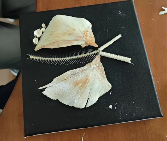 有的同学用鱼骨拼出了美丽的蝴蝶,振翅欲飞的姿态仿佛带着生命的灵动;有的同学则巧妙地将鱼骨融入风景画中,构建出奇妙多彩的自然。在制作过程中,同学们深刻感受到了鱼骨文化中蕴含的环保理念和对自然的尊重,每一根鱼骨都仿佛诉说着大海的故事。
